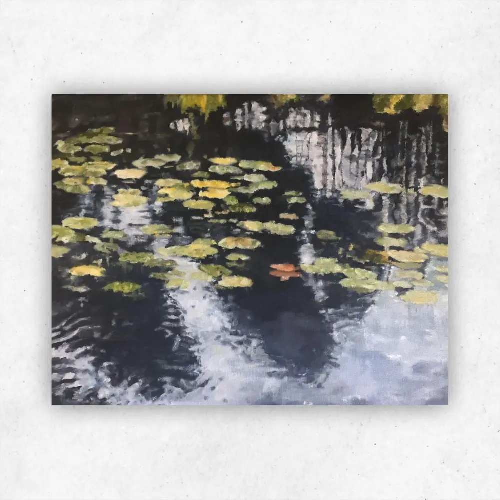 Julie Tugwell captures the Knysna Pezula Pond and water Lilies in an Impressionists style influenced by the brush strokes of Monet.