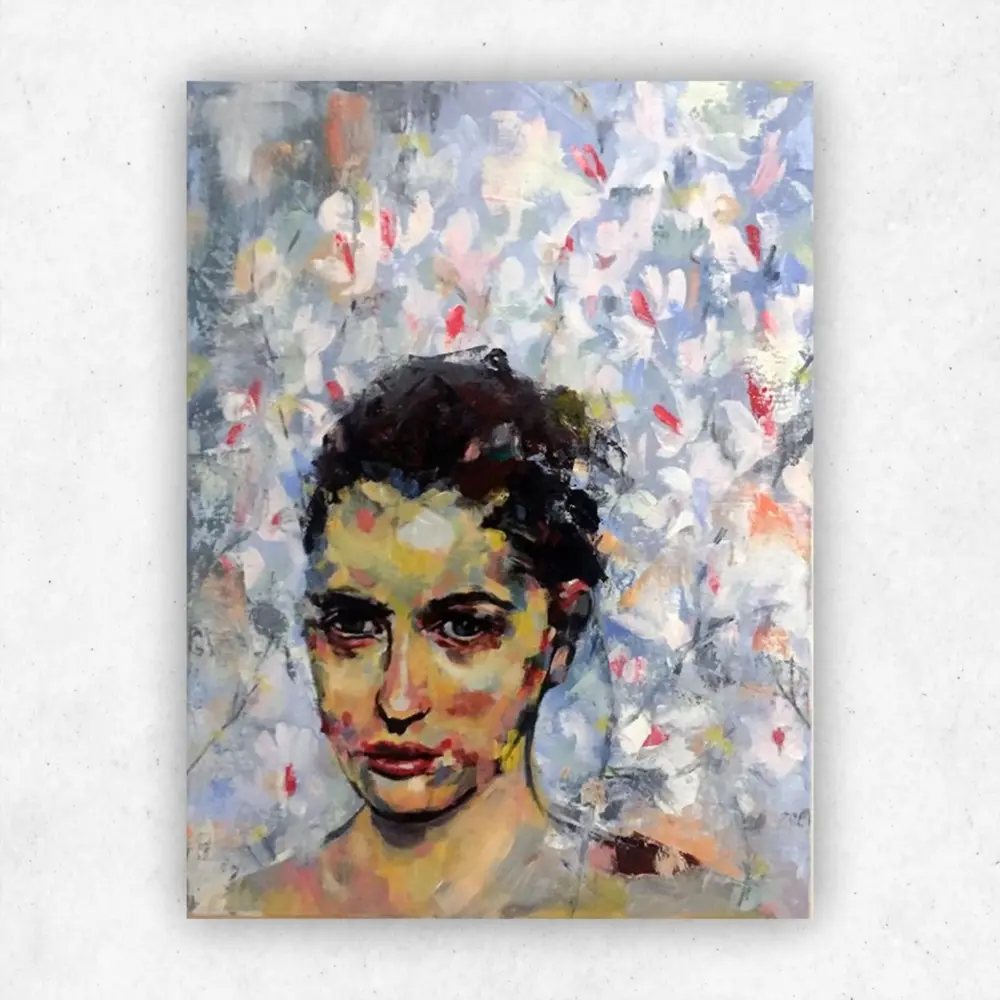 Start your art collection of wall art with a rosy-cheeked portrait surrounded by flowers, a reminder of Summer.