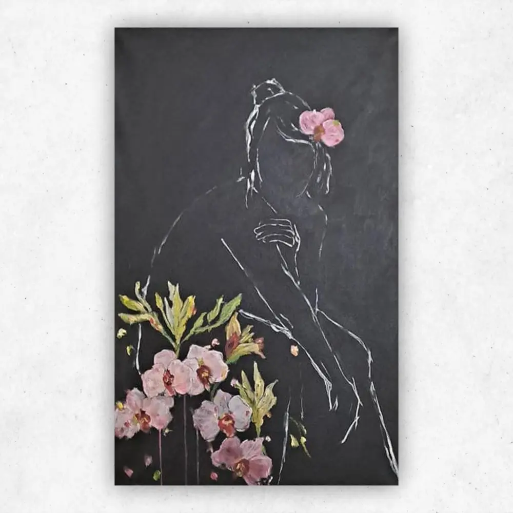 Painted Flower and Figure art by Online Gallery owner Julie Tugwell – The Flowers of my He(art) is a tender and striking acrylic painting on a black background making the pink Orchid flowers pop with pink colour.