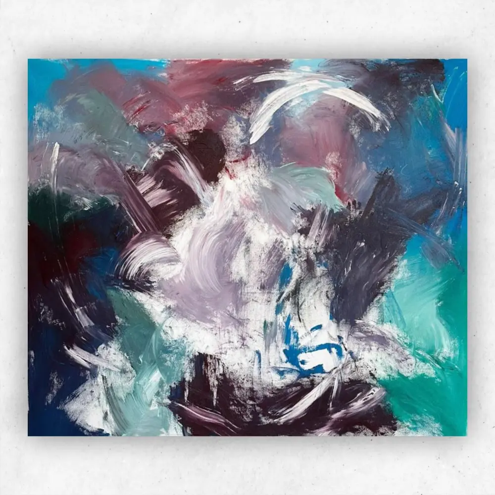 In There’s a Rhythm, emotion becomes movement, and the canvas pulses with instinct. Broad, expressive strokes clash and converge like internal tides — teal and ultramarine whisper calm, while plum and jet-black collide in disruption. There is no obvious structure, yet the composition breathes with an unspoken tempo, as though something buried deep has found a way to surface through motion rather than form.